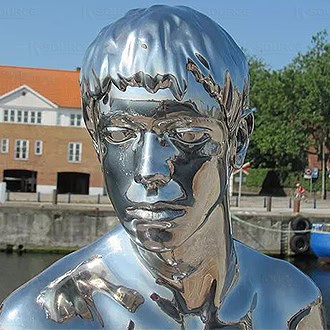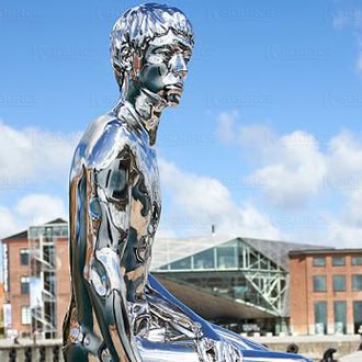 A boy sits on a hard metal stone shape. The boy’s body is also made of shiny stainless steel, and his eyes look towards the ocean.