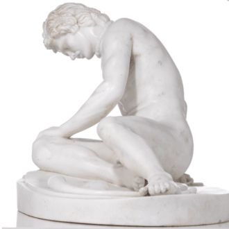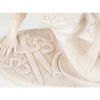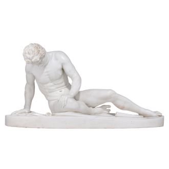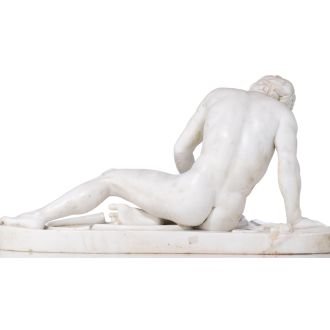 A replica of the Dying Gaul statue is pictured here, showing a Gallic warrior wounded in battle and a dying state. The dying Gaul is sitting naked and slumped; his body tilts to the right, his right hand struggling to support the ground, and his other arm weakly placed on his bent leg. He tries to get back on his feet and fight his enemies. The warrior has a typical Gallic hairstyle and mustache. Underneath his body is a shield protecting him. His weapon is at his side, and the right side of his body is stabbed.